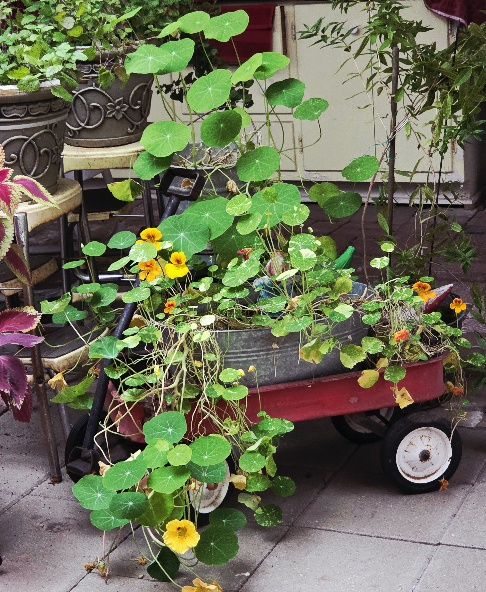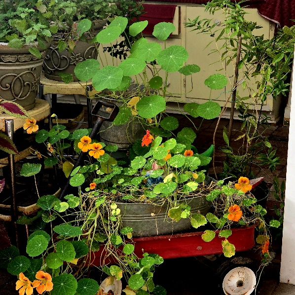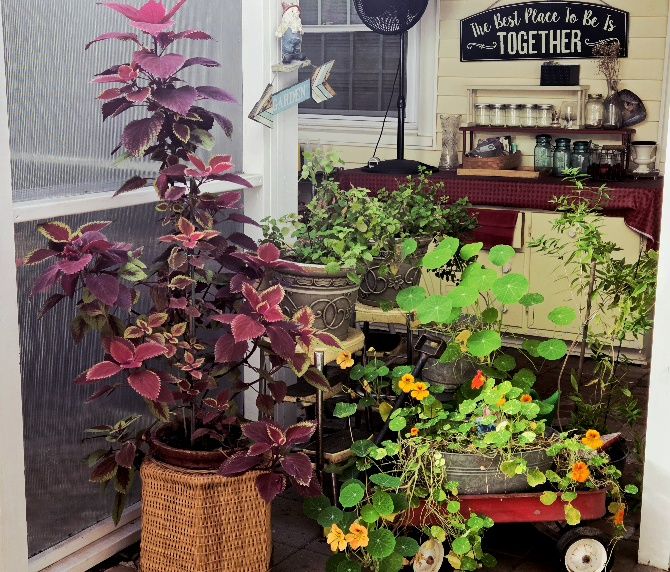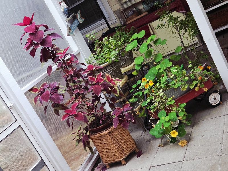 Meanwhile, out on the back porch, the Giant Coleus, now two years old!, stands tall over the mint, and the Nasturtium is growing as if it’s Spring, blooms cascading onto the floor and leaves as big as a plate!!!