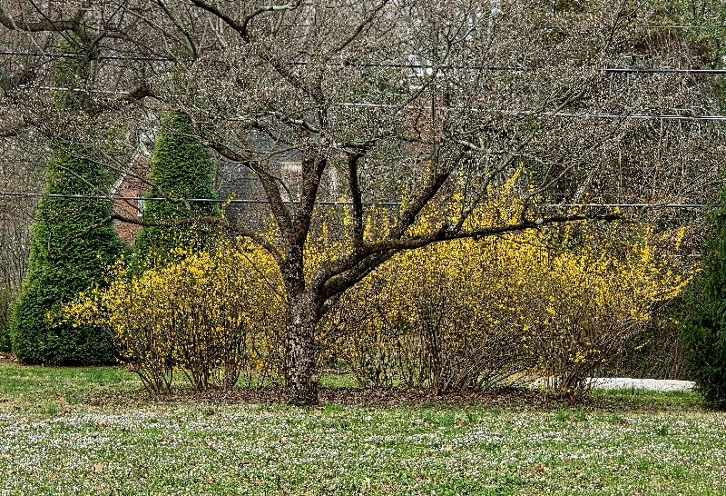 We’re expecting a hard freeze Monday and Tuesday, so we’re preparing some covers for our roses. We’ve lost the first buds for the last two years! But my lovely forsythia have got their blooming done…