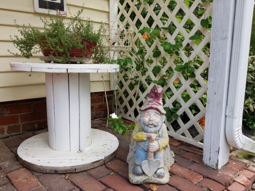 Have you met Larry Garcia? I bought him at a rummage sale for $3. To me, he looks like a mashup of Larry Caplan, our old County Ag agent who taught my Master Gardening class, and Jerry Garcia, you know, Grateful Dead Guy? He gets moved around on a regular basis, not an easy task since he is stone(d). Heavy, man..