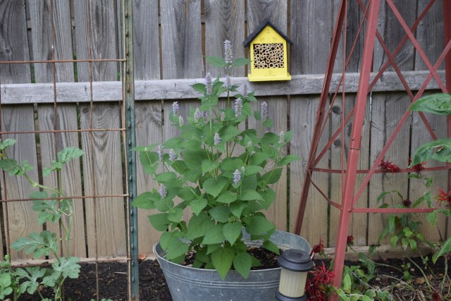 My scheme to attract bees is working! The anise hyssop is in bloom and the bees have noticed. I put a bee house nearby and there’s some mud beneath the windvane for them to leave some cocoons.