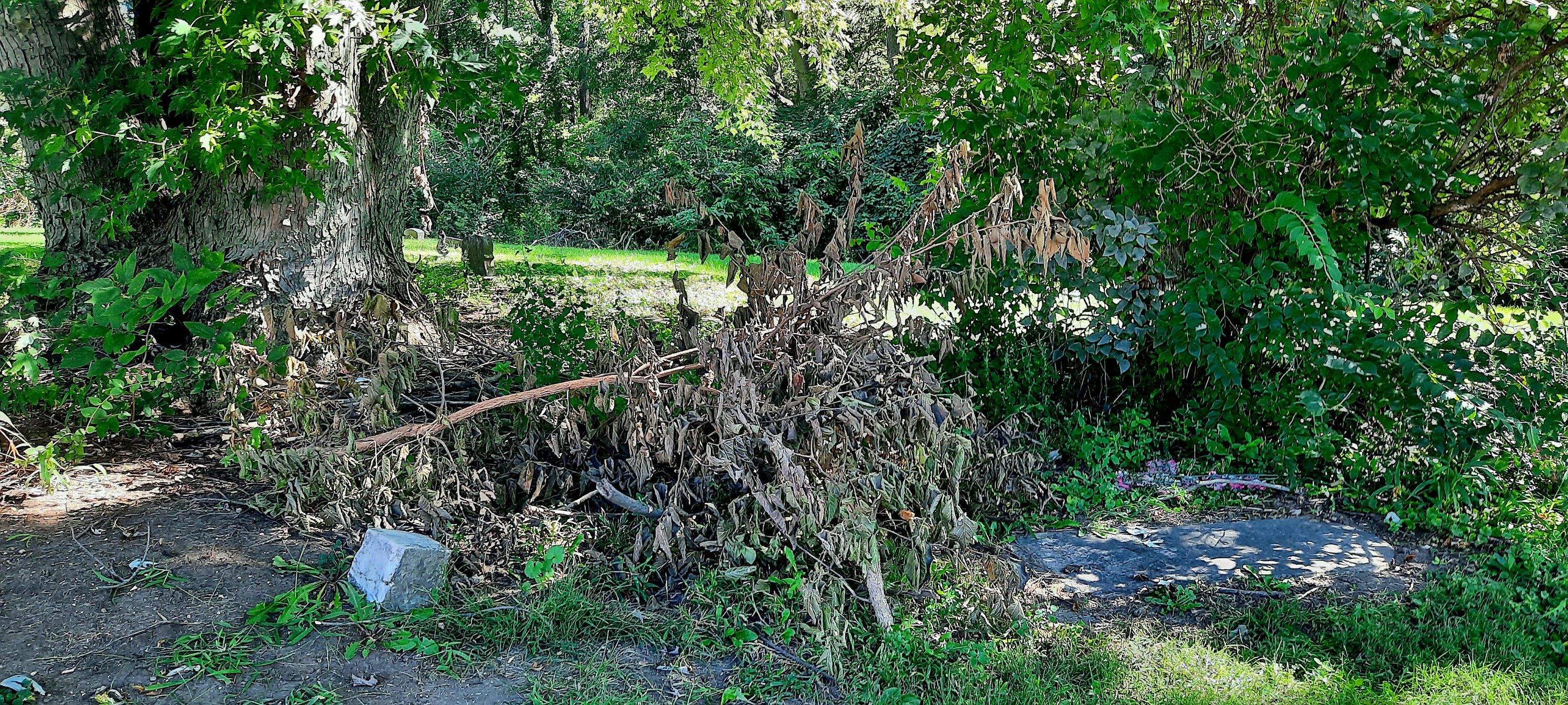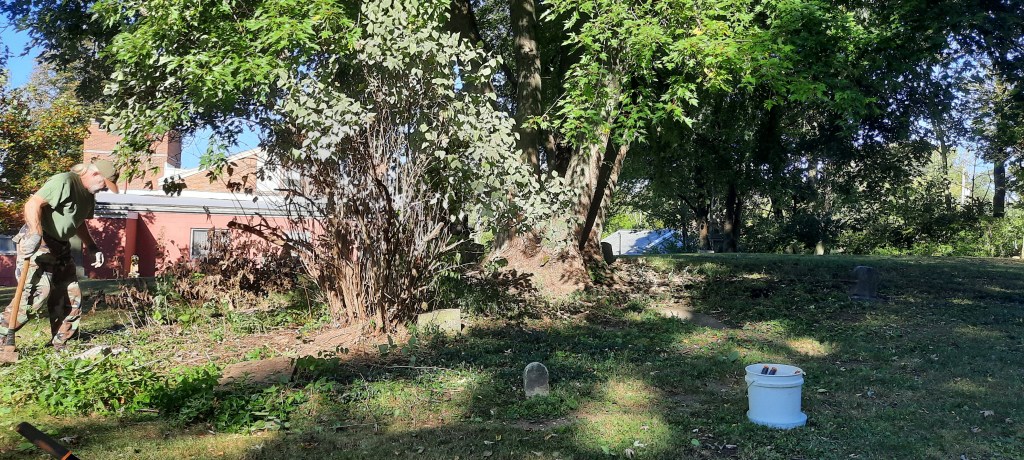 We took a mid-week trip to Ohio to visit the church founded in 1854 by my 4x great-grandfather, Adam Mayne. The building has been, of course, altered since then, but still sits in the same spot. There is also a cemetery where Adam was buried in 1857, possibly the first person to be buried there. Y’all know how much I love cemeteries and I was pretty excited to see this Major Patriarch’s gravesite, so imagine how bewildered I was to find that a tree – at least 50 years old — had grown up in the center of the Maynes’ headstones, a shrub had sprouted that added to the damage, covering several, and that the base of the tree was being used to throw broken limbs like it was a trash heap!!!
