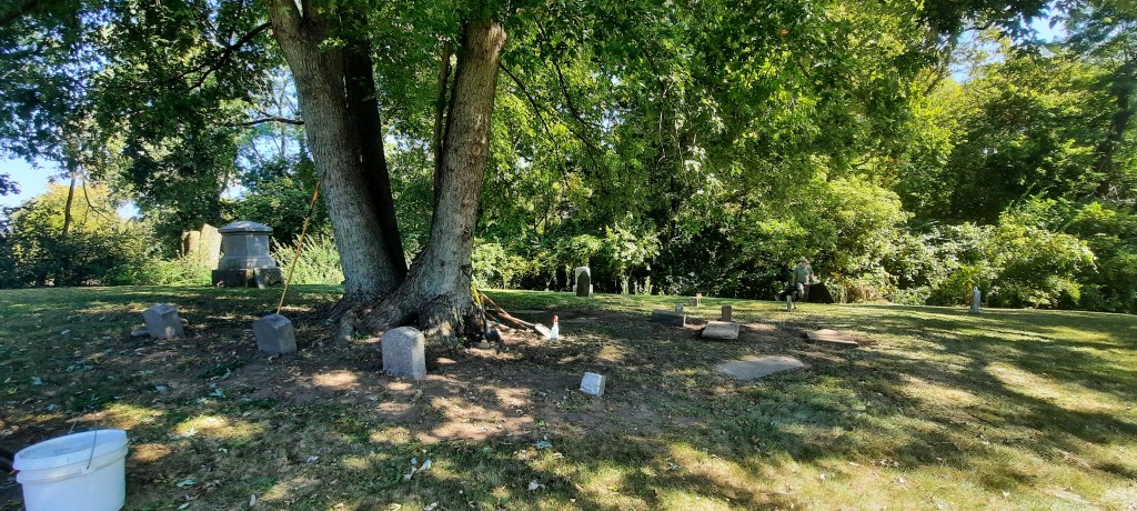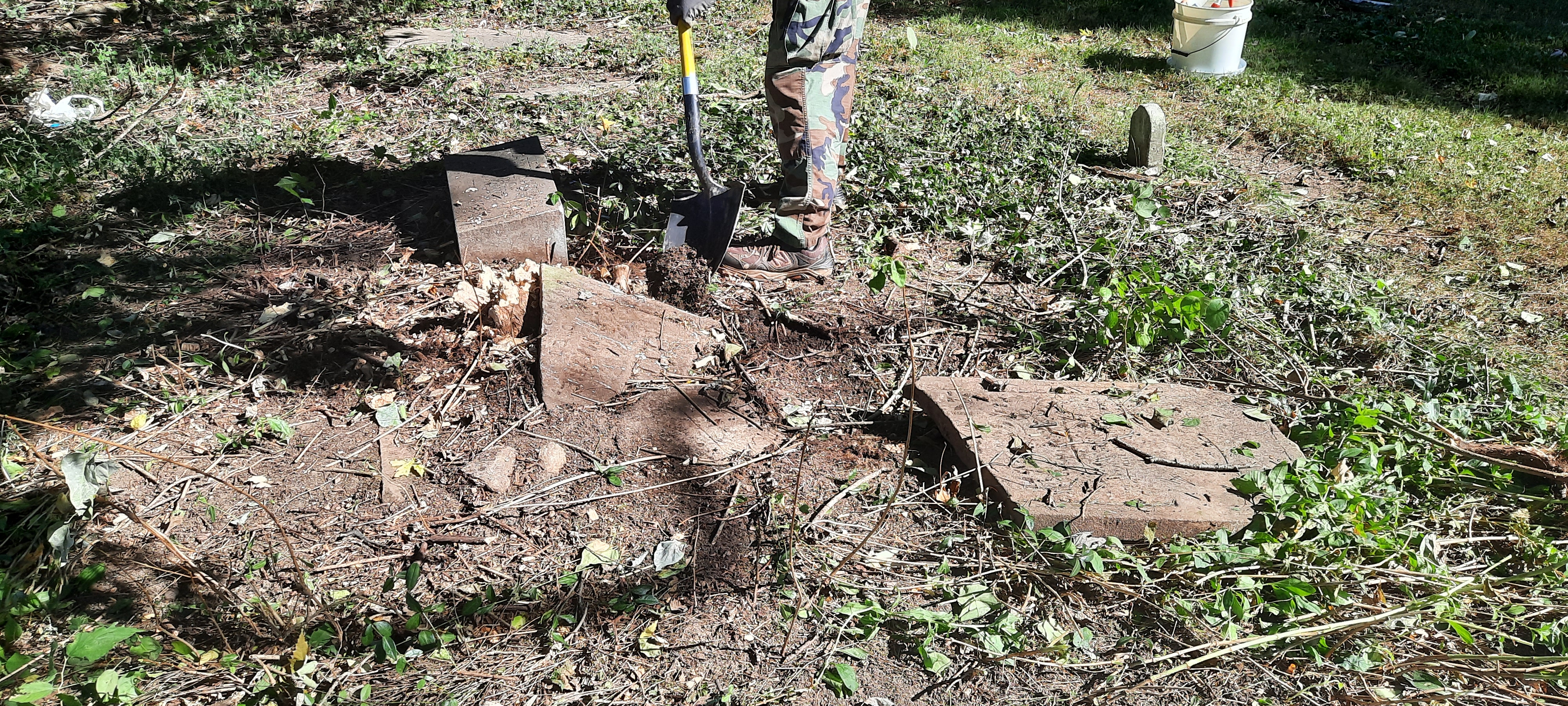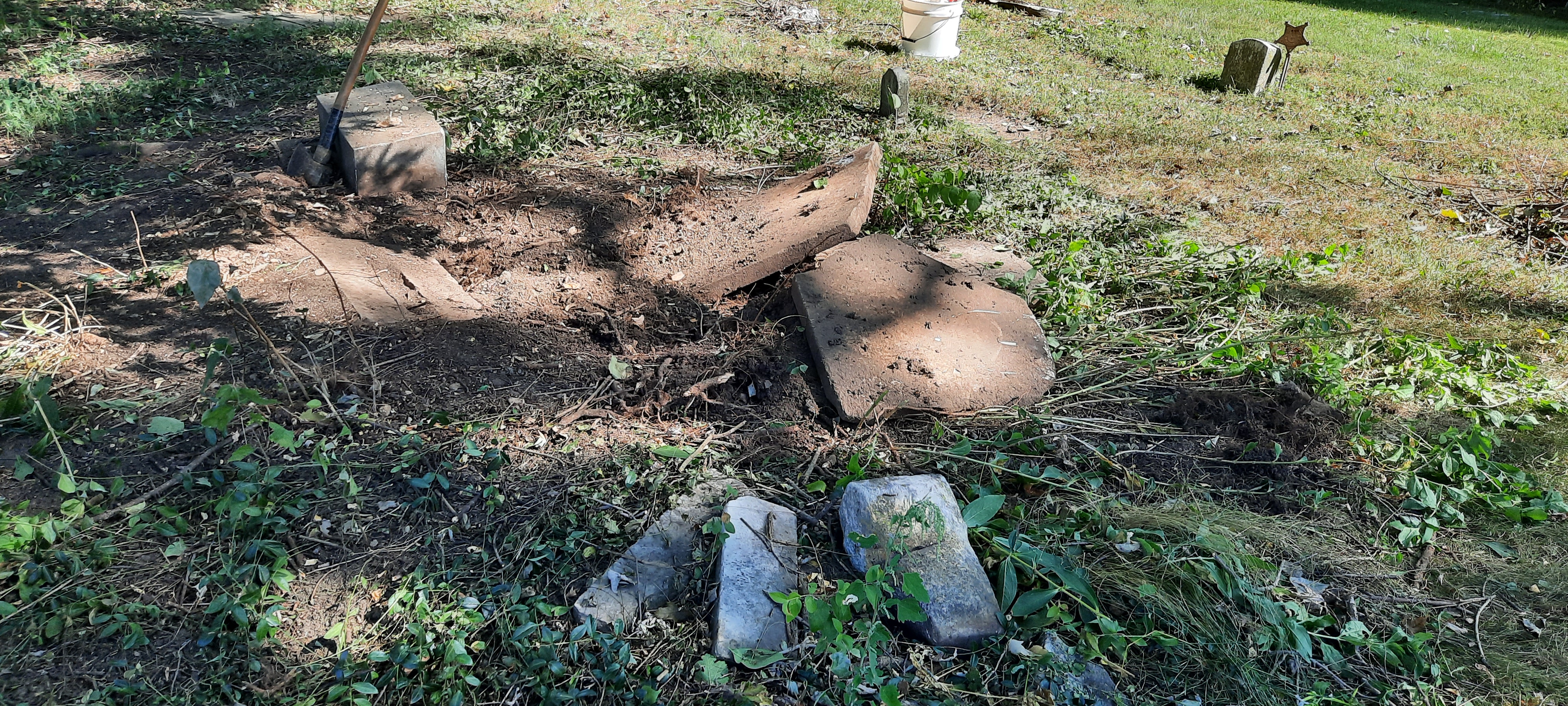 Can you believe the difference? What was most rewarding for us was finding the stone of Tobias and Emory, two of Sarah’s children who had died in infancy. Their stones had been thrown under the shrubs, (see the white ones above) so I don’t know where they originally stood. Sarah’s marker was a pretty even break, so we laid it down on the original base, leveled it, and put the babies’ stones at her head. I heard angels singing as we reunited the mother and infants.