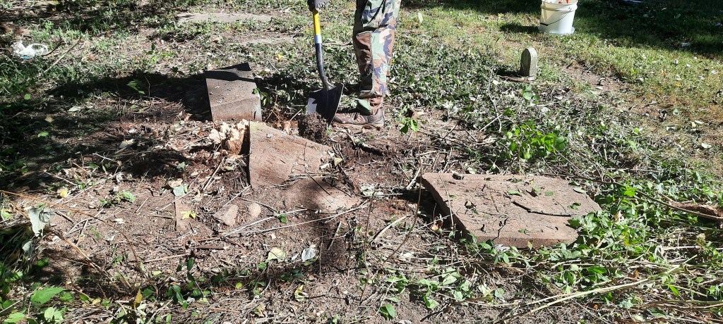 As we were leaving, we made one last trip by the cemetery. As we checked and admired our work, we noticed a stone sticking up – it almost tripped me, and ran down to grab a shovel. Sure enough, it is Adam’s stone, I think, but we didn’t have time to do a total excavation. We covered it back up and started planning to return.