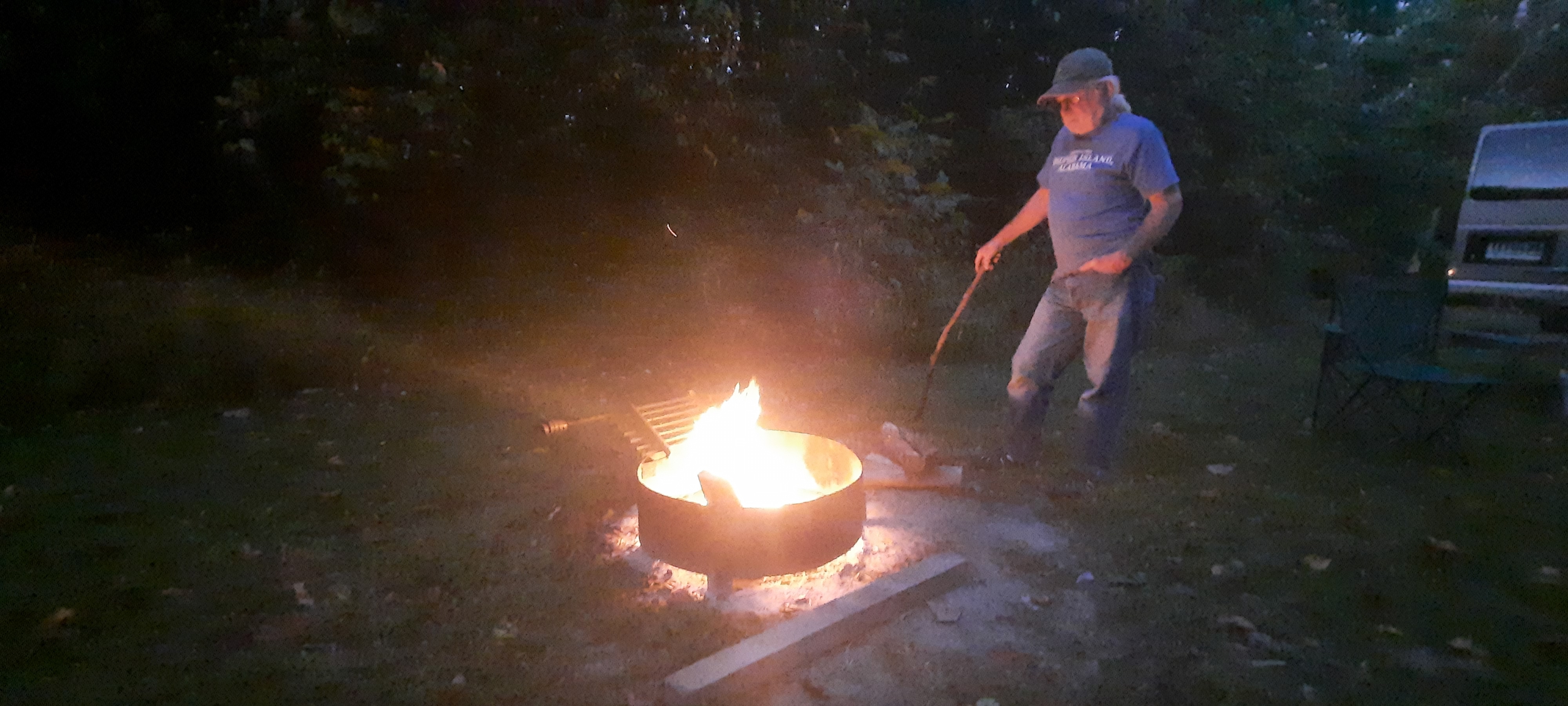 It was a great day and after a shower back at camp–the shower nozzle was the size of a sink faucet and sprayed everywhere except on me, so I did a little dancing–we enjoyed an even in camp with hot dogs and fire-staring…