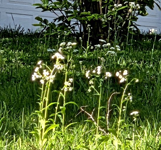 Our lawn is going to need mowing before Casey’s able, and I’ve talked with Michael about coming over and getting the front and side knocked down before it gets too overgrown. I have always wanted to forego mowing the meadow, all the way down to the woods with only a path around it, to see what wildflowers would grow up there. Looks like I’m getting my wish this year (for a while) and there are lots of oxeye daisies, violets, and others I can’t name. I can’t seem to get a good picture, either, but here we are…