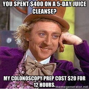 So I’m left to only complain about clear liquids for two days, drinking a gallon of powdery gross stuff, pooping my brains out, then pooping some more.
