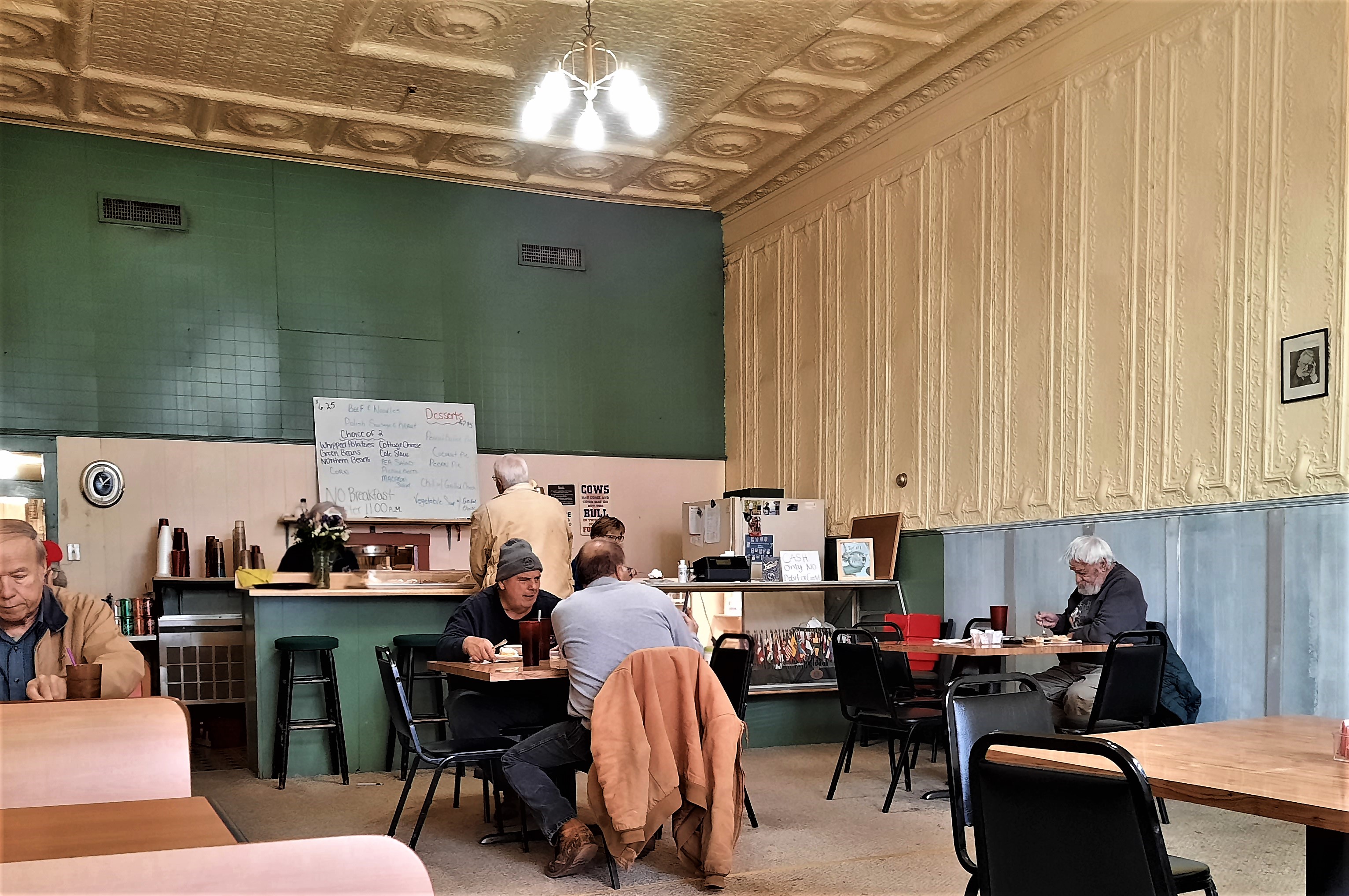 The place is a throwback to the olden days, both the building and the menu. Plate lunches and breakfast all day (back then). Real mashed potatoes with real gravy. Liver and onions on Tuesdays. Perfectly griddled grilled cheese sandwiches. Coffee from a Bunn percolator. Fresh pies. The owner was the cook and the servers were her sisters and her nieces. After 39 years, she’s now 80 and has sold the place; it will shut down for renovations on December 18. Her niece, Kim, and I had become good pals back in the 90s and I’ve always enjoyed seeing her when we’ve stopped in during New Harmony Events.