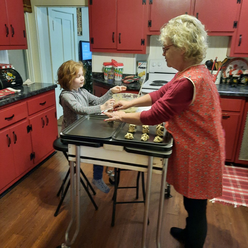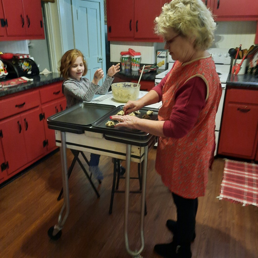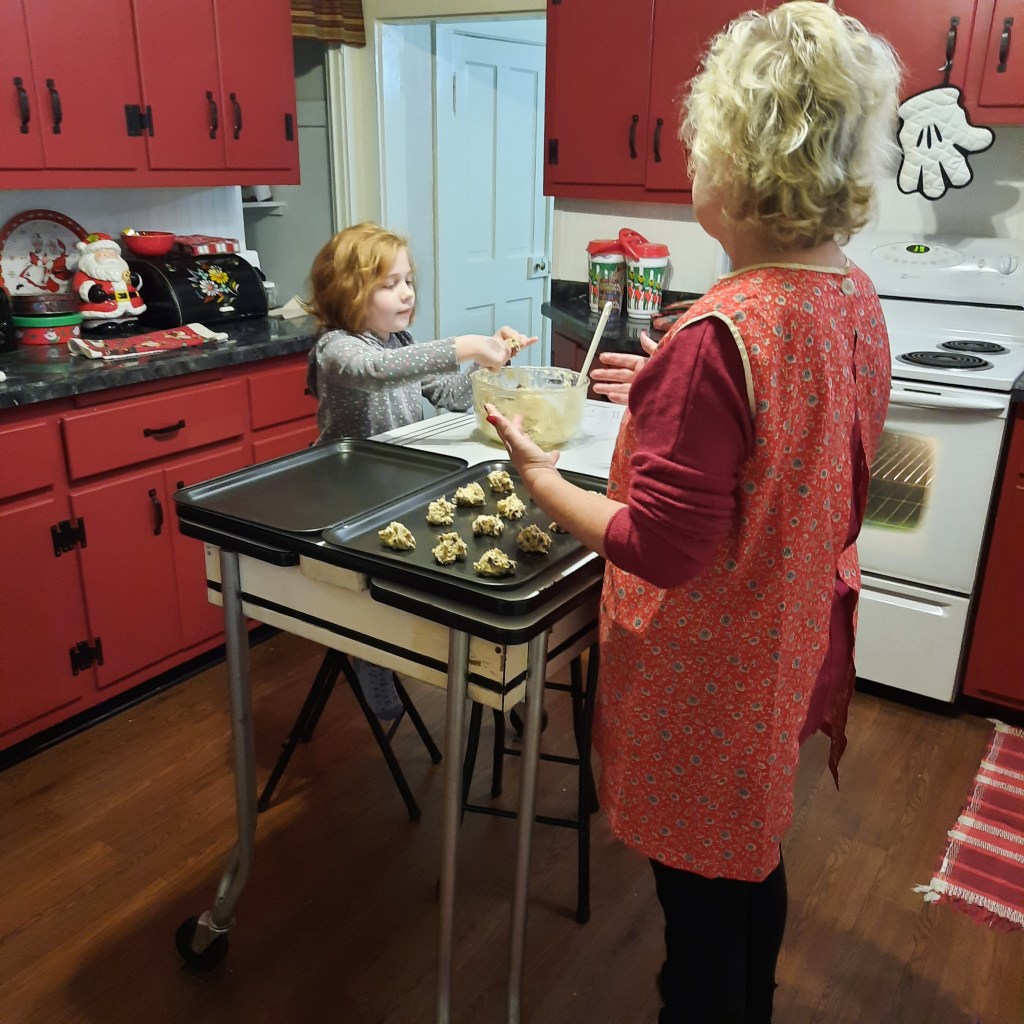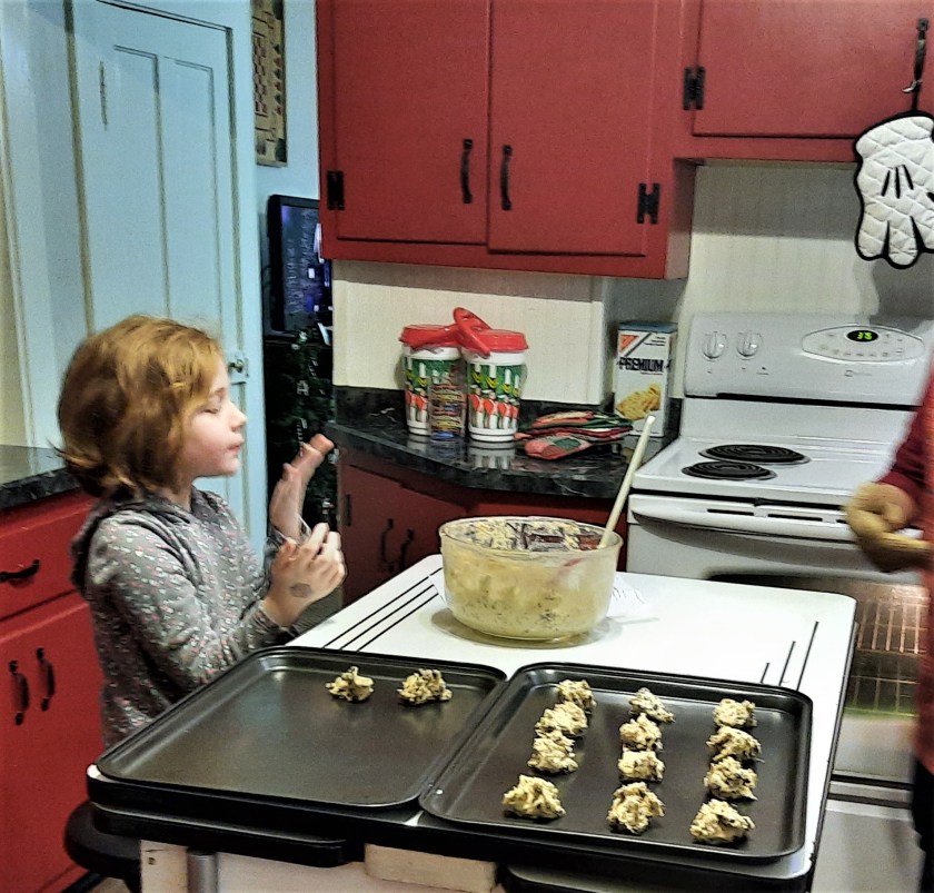 We baked chocolate chip cookies yesterday and Samantha was a Super Assistant in charge of handing me a rounded tablespoon of cookie dough. This was her first real chance to eat raw cookie dough, made from scratch, and I’m proud to have been her guide.