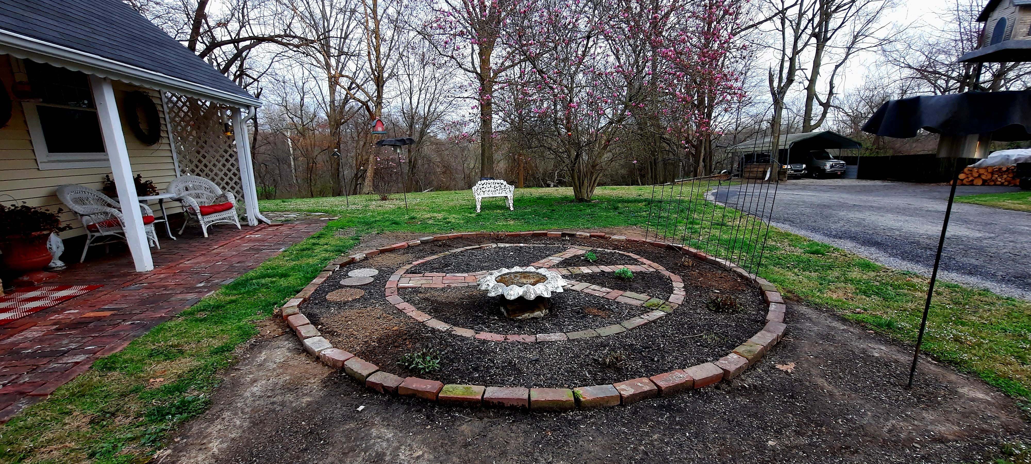 We’ve been out in the Peace/Bird Garden all day, moving around purple coneflower, autumn sedum, bee balm, a few surviving rudbeckia, and discovering forgotten gladiolus bulbs scattered throughout. I had already moved a lot of bricks to make the peace sign a double circle and I’ve been imagining where I wanted to move the echinacea for a while now. The day was perfect and we got a lot done.