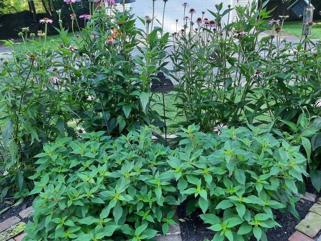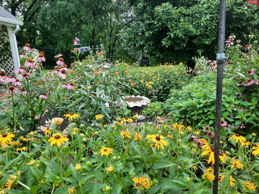 I’m bemused by the hydrangeas…we have all colors growing side-by-side, a veritable rainbow. We’ve never put any lime or whatever it is people to turn them different colors. The pink one, by the way, was a gift from my old Bunco Club when my dad died 24 years ago; we call it “Dad” and it just keeps giving.