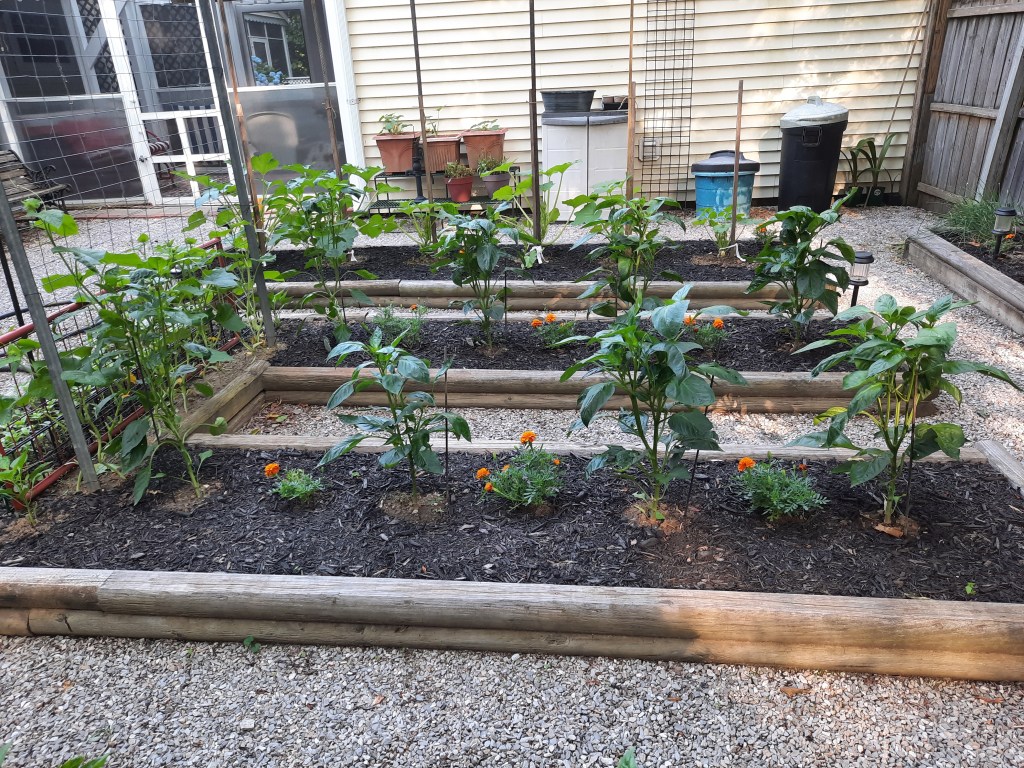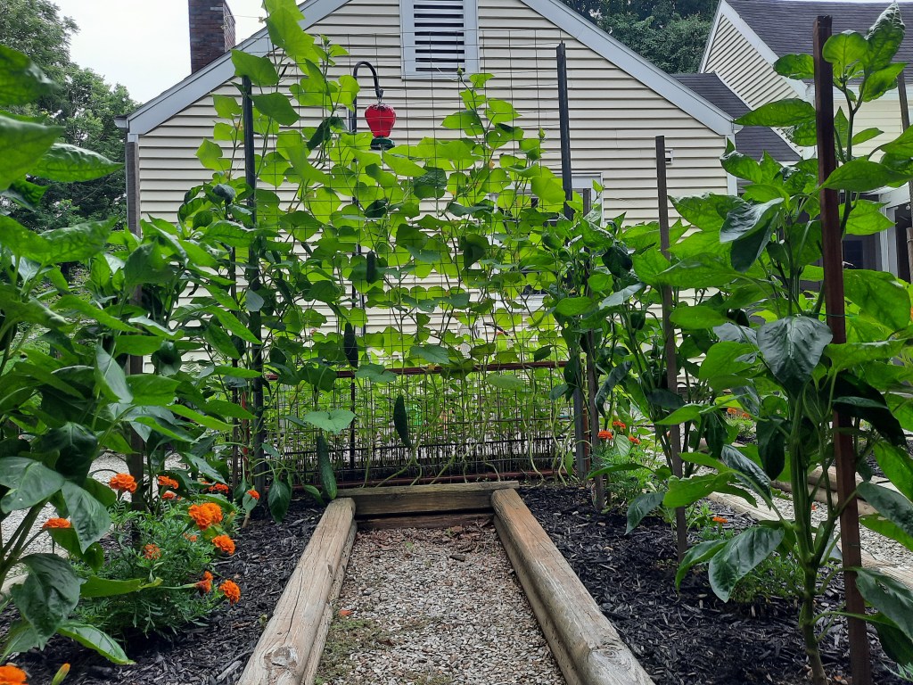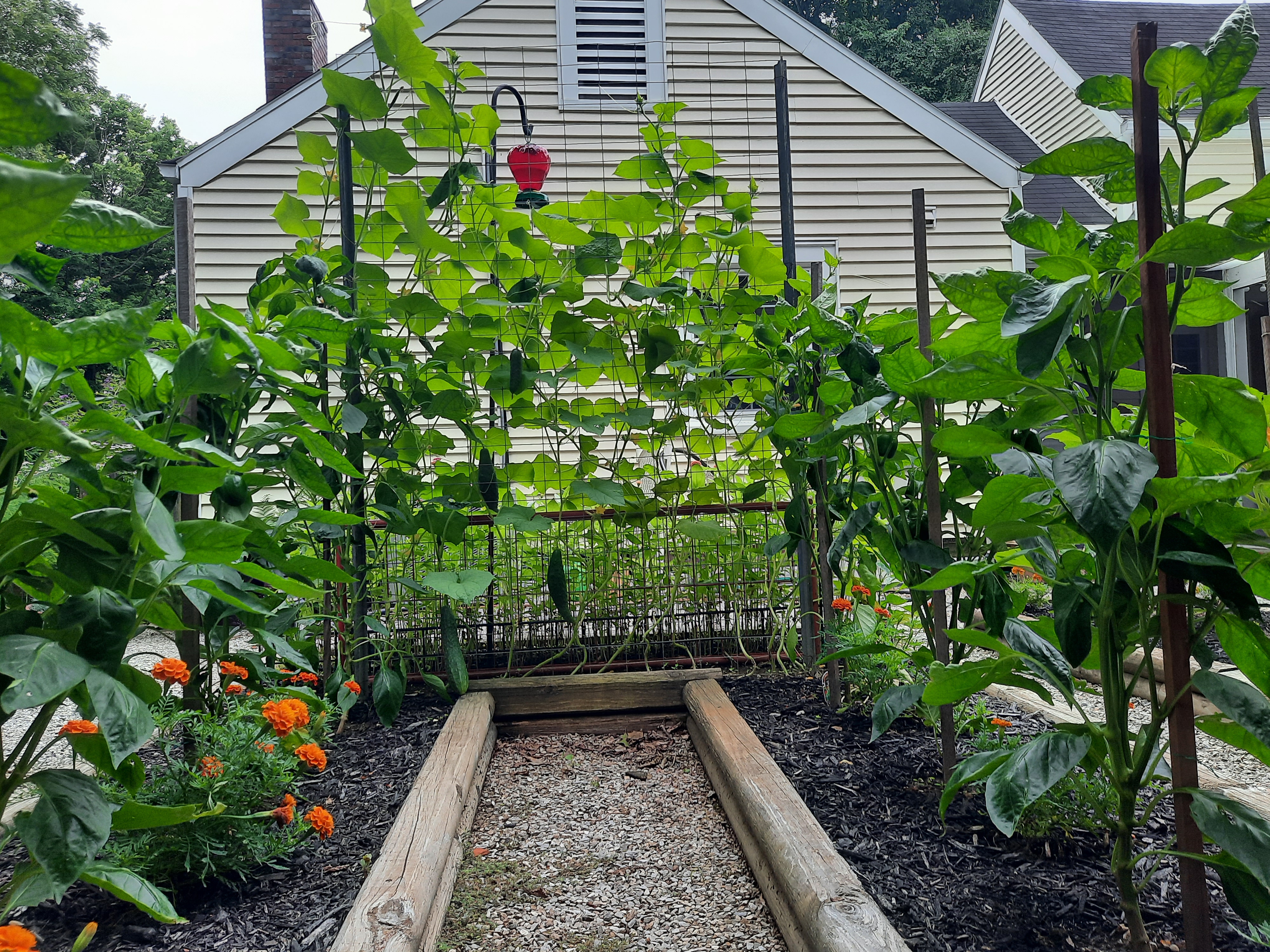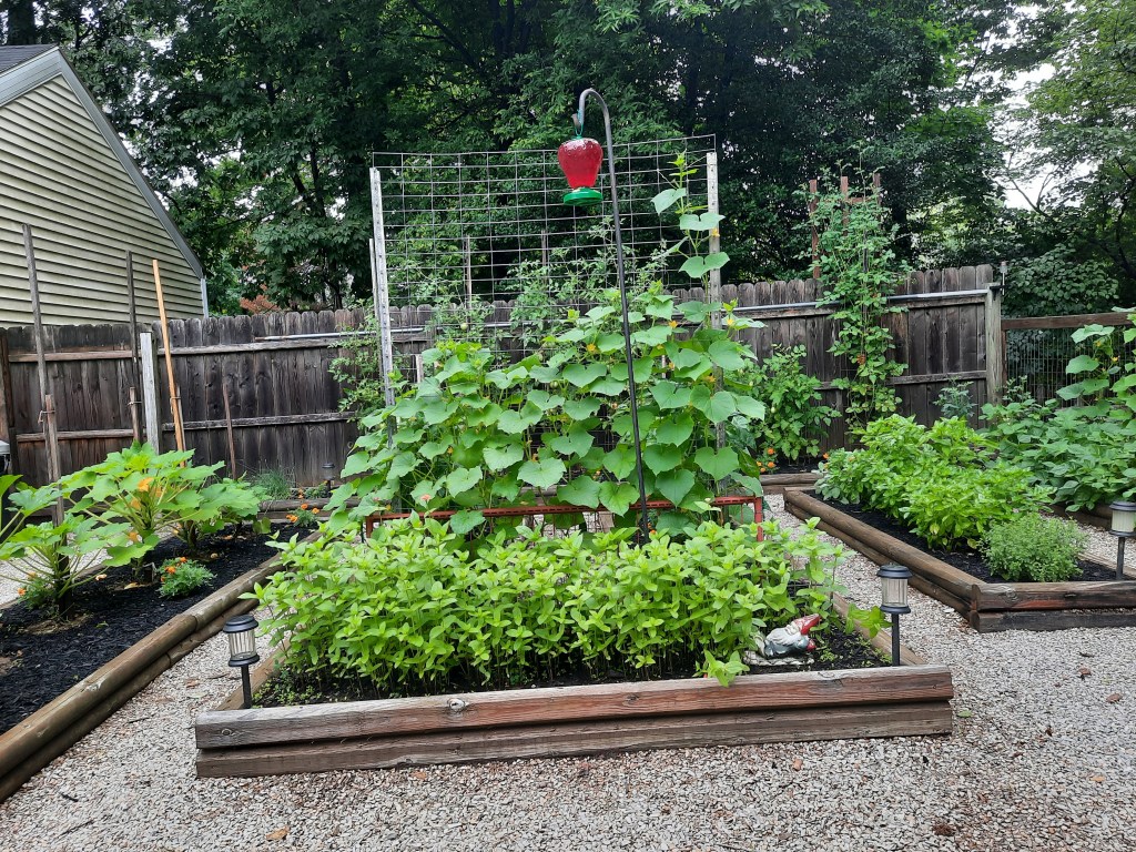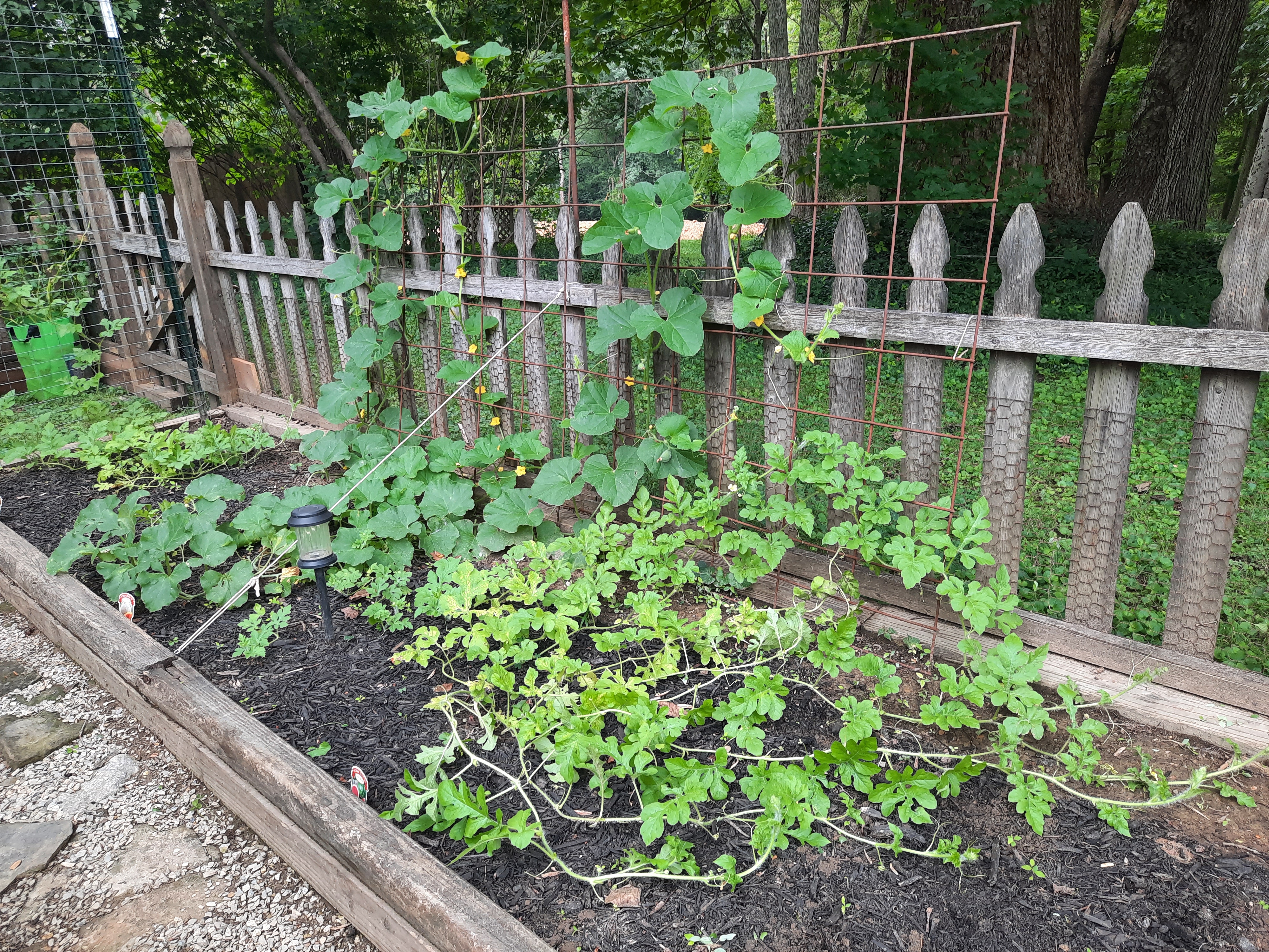 We’ve added on (again) to our veggie garden, moving the fence back about four feet and adding a gate. I’m full of ideas for a shade garden that lines a gravel path leading down to the firepit. I also potted up the parsley, sage, and rosemary to make room for the tentacles of the watermelons and cantaloupe.