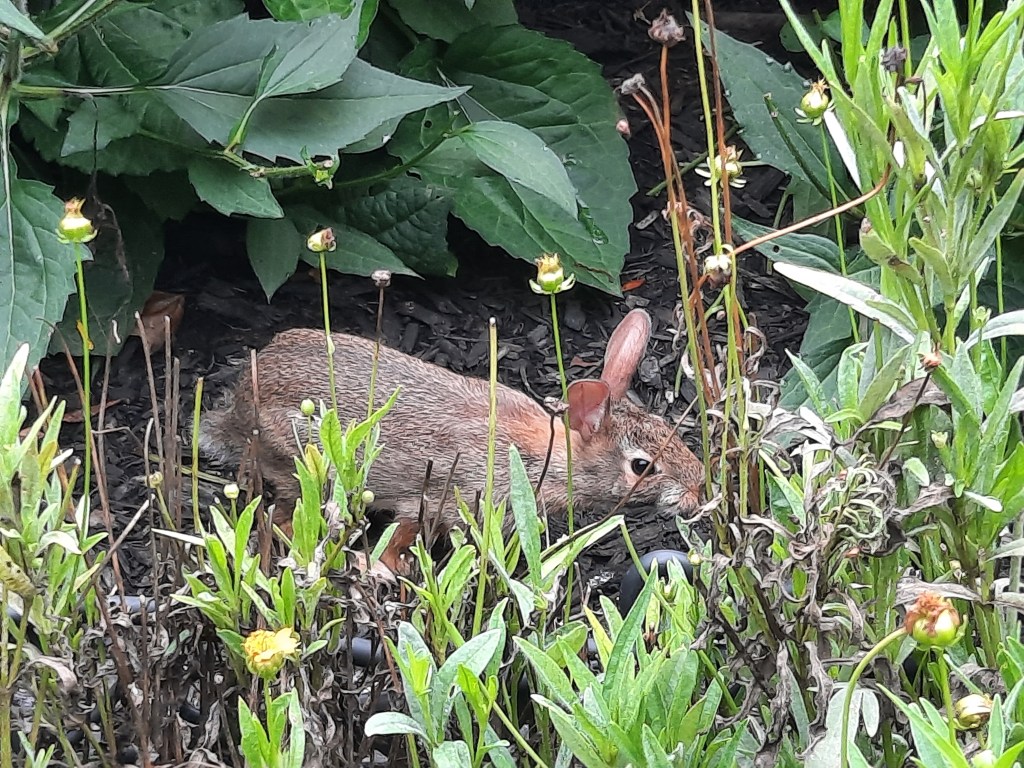 Hopper was a wee fella* when he presented in the veggie garden and destroyed a few green beans. We covered up all the holes he was using to get in, and he learned to be quite content around and in the Peace/Bird Garden, munching on leaves, clover. He’s rather tame and will often stay eating a couple of feet away from where we’re working or sitting as if he were invisible. We’ve seen neither hide nor hair of a mama or siblings, so I believe he was pretty smart to set up camp here near our house and away from the coyotes and hawks. I probably shouldn’t name him, but name or no name, I’ll be sad if something happens to him. *He may be a gal and that’s okay, too.