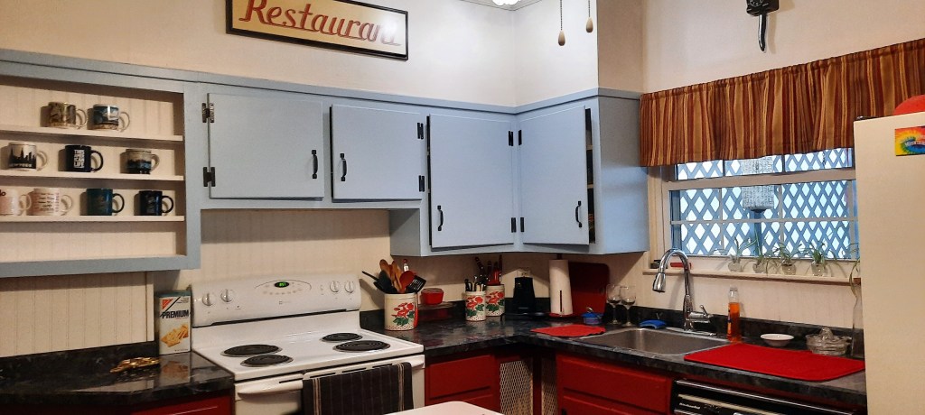 Kitchen Remodel Update: All of the cabinets have been painted (and cleaned), the glassfront cabinet has been painted (white for now because we’re almost out of blue). Everything looks clean and crisp.