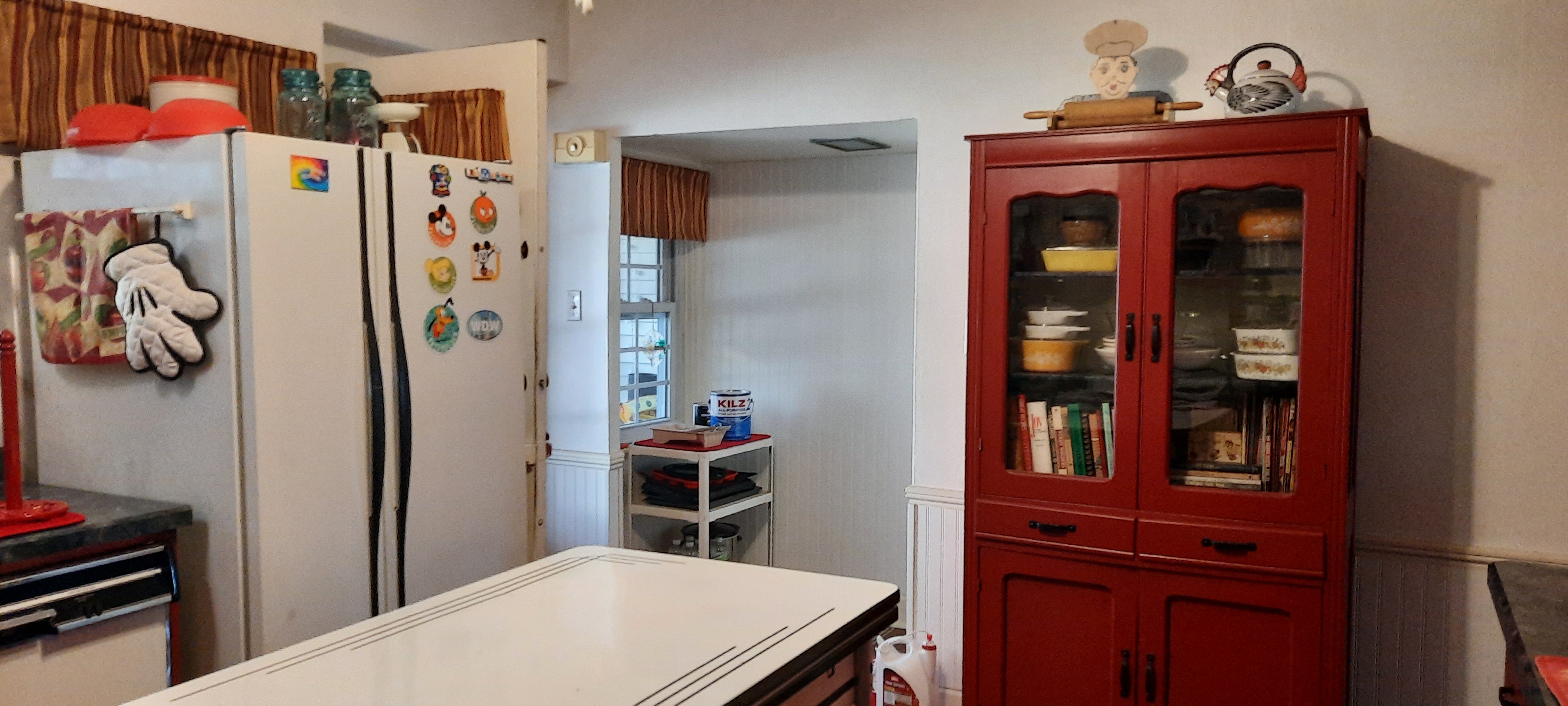 Phase 2 includes moving the refrigerator, hanging some new wallboard, putting in a base cabinet (already purchased), new countertop and lots more behind-the-scenes stuff like finding a place for everything. We hope to be done in 2 weeks, but availability of countertop may affect that goal.
