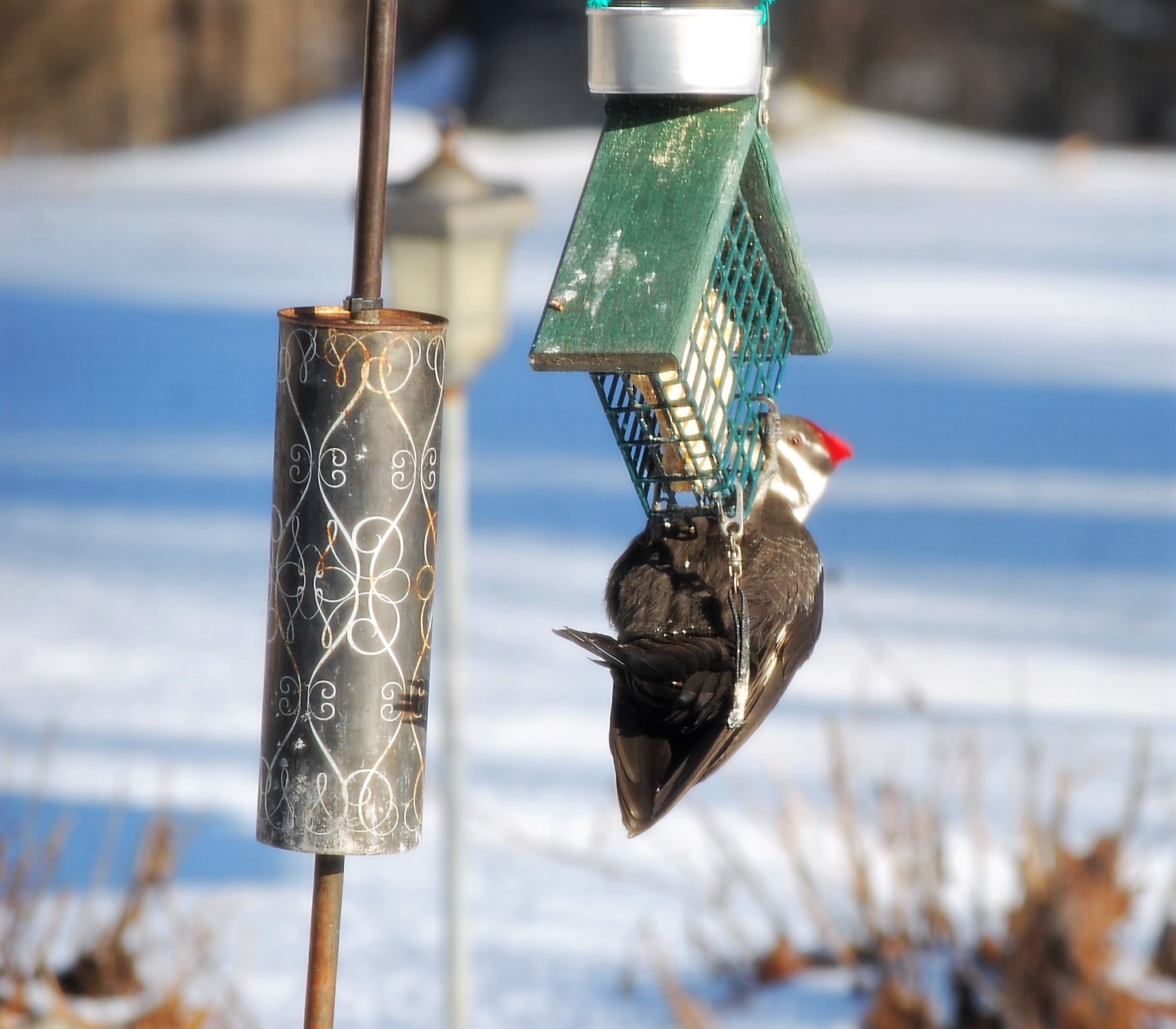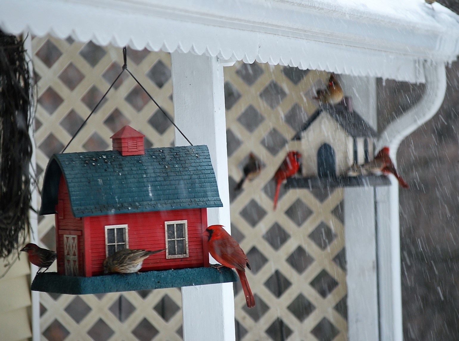 There is an upside to a sleet/ice/snow storm…the birds flock to our food. We moved the feeders to a spot under the porch so the ice couldn’t cover them and brought them in at night to dry and warm. There were never less than 30 birds in the area, lots of juncos on the ground, dozens of cardinals, finches and wrens of all sort, woodpeckers, and those damn grackles, too. One awkward pileated woodpecker showed up, too…