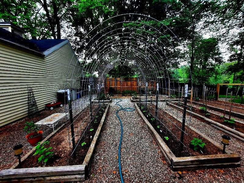 It is cold and rainy today, but our garden plants are fine with it. We have wisely waited to plant the sweet bell and banana peppers, but this should be our last cold snap. I am so excited about the garden this year because we have added a cattle panel trellis- Growing up the trellis are cantaloupe, butternut squash, sugar baby watermelons, burpless cucumbers – all except the sugar babies I started from seed! There’s also some King of the Garden butter beans I popped in the other day. and some sunflowers, too. We’ll fill in the sides with bush beans as soon as the weather permits.