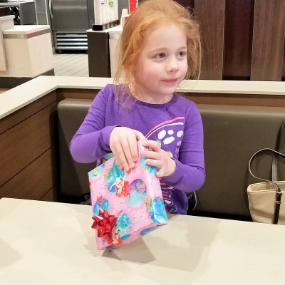 I had a freebie coupon from Bath & Body, so we also picked up an Ariel hangy thing for her backpack. We were happy.