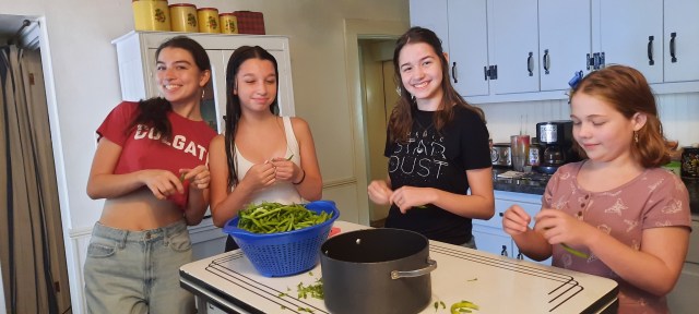 Emma, Eliza, Nova, and Samantha snapping beans…
