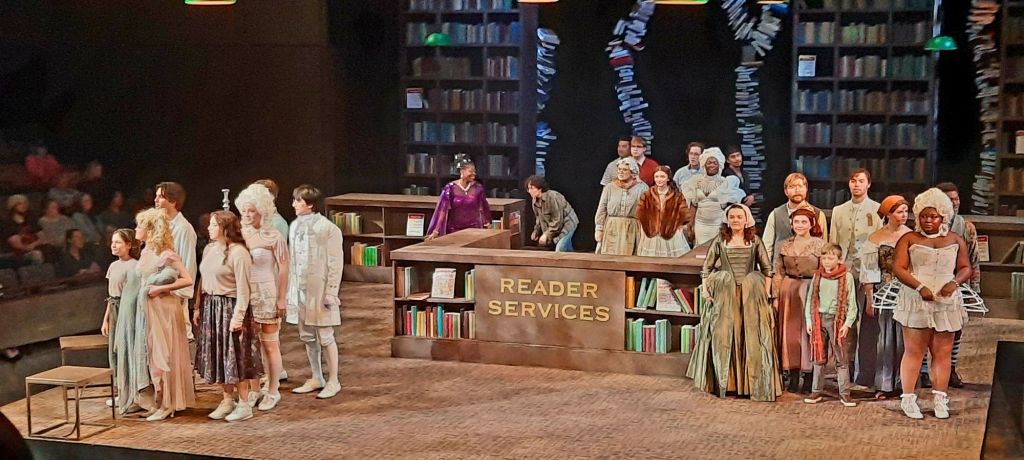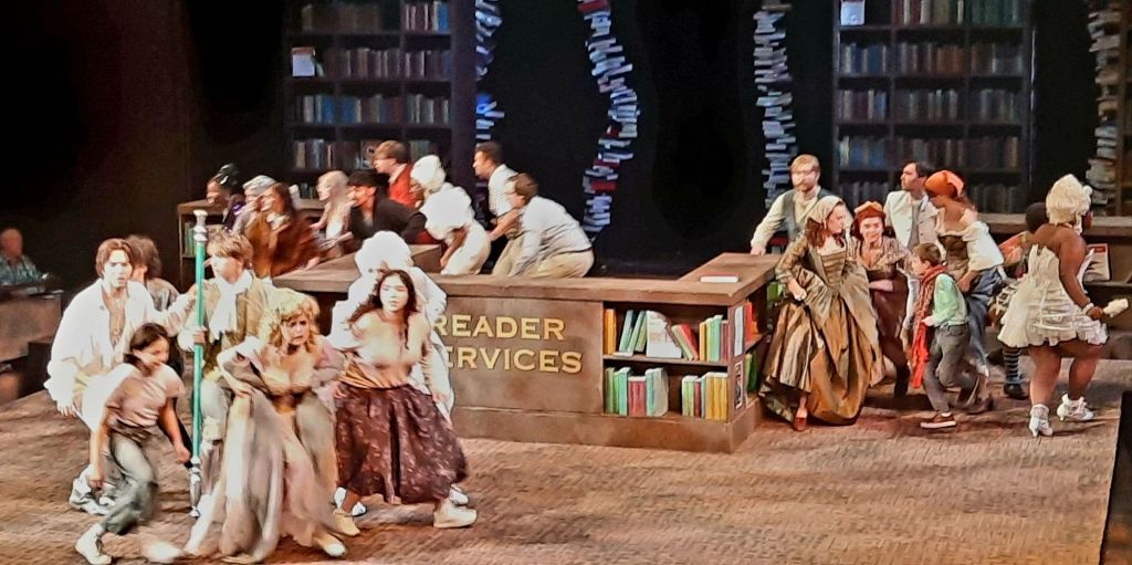 This beautiful Stephen Sondheim musical was introduced to me by my daughter when she was in high school, around 1990 or so, and played a VHS tape of the original Broadway performance over and over…and over. More recently, 2022, she and I saw the revived Broadway production together. I really love this musical; it is so complex and the music is so good. The UE production was nothing like what I saw on the tape or the Broadway stage. This version took place in a library, where the librarian is actually reading the fairy tale to some children. The scenery remained the library, though the children moved off stage until the end. It was much lighter, with laughs and broad characterizations — like a fairy tale! — where you feel a lot of fears and tears in the Broadway version. But the Music, the wonderful writing of James Lapine and compositions by Stephen Sondheim, was the same and well-sung by the talented cast of Theatre majors. I really loved it!