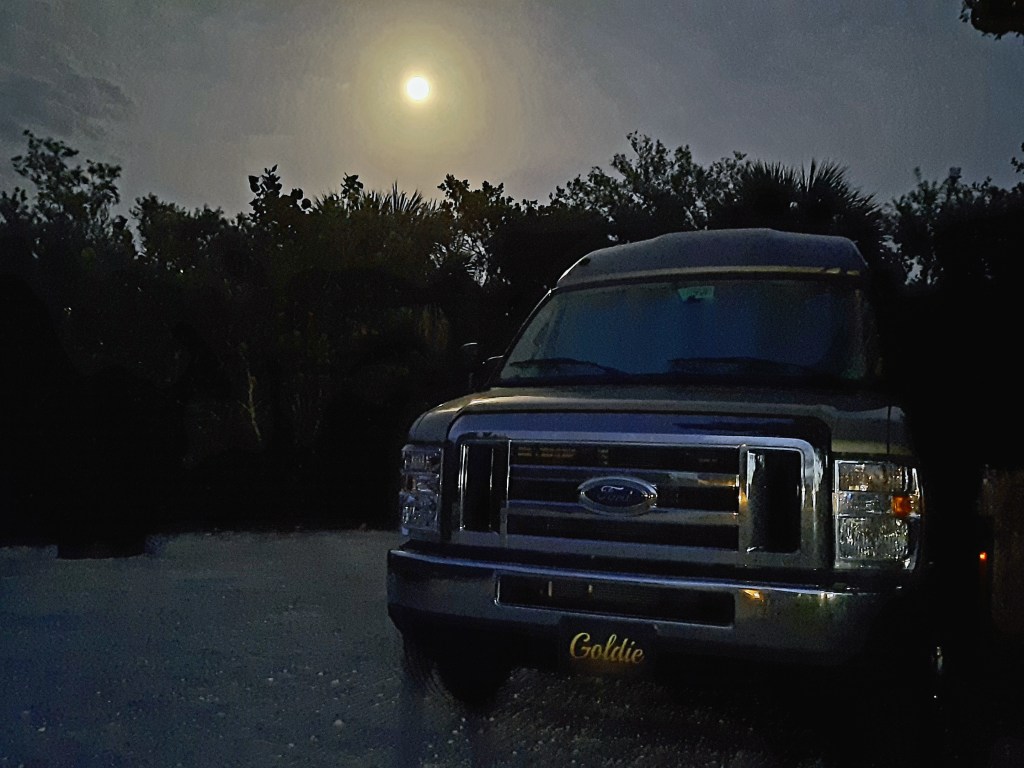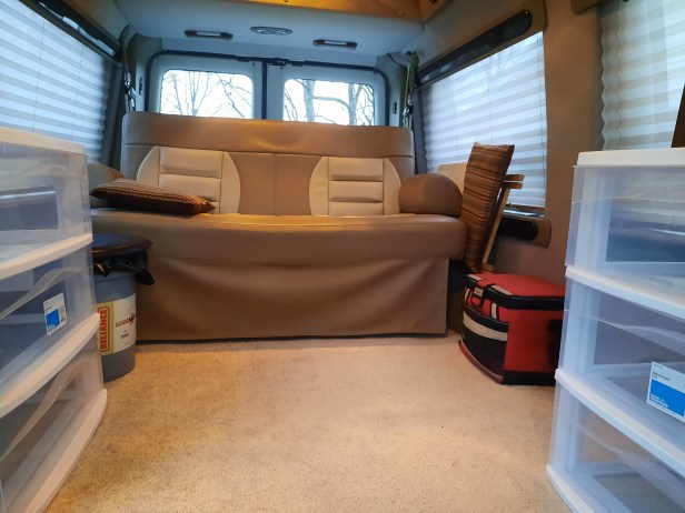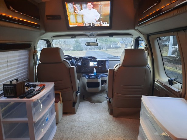 As You know we sold the travel trailer quickly and started exploring our options. Particularly we considered just How we wanted to use a camper. We didn’t like the snow-bird camps in Florida — too clique-ish, felt like it was a secret society. KOA was helpful for overnights when there’s a lot of driving involved and affordable, too. We wanted the capability to drive up into the higher elevations and/or to boondock. We ended up buying Goldie, a 20-ft high-top conversion van, and started making changes to meet our needs. Casey reworked the electricity so that we can plug into shore power; we removed the passenger seats and put in two 3-drawer plastic bins. The bed folds down and we figured we’d be able to sleep sideways, curled up, without difficulty…but maybe not…