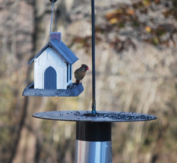 The Clowns of the Bird Garden are the squirrels. I think they must have some sort of bionic eyeball to do the geometry of overcoming our squirrel baffles and they do not give up. Recently we watched while a small gray squirrel worked and worked until he made it up a well-defended pole to the feeder. Once he made it up there, he could always make it up there. Casey did a couple of modifications and thwarted him, but his persistence and determination were admirable.