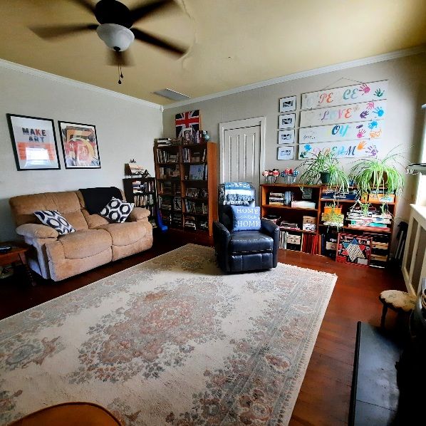 All of the books that were in the family room have been moved into the living room and we are very close to pulling up the carpet.